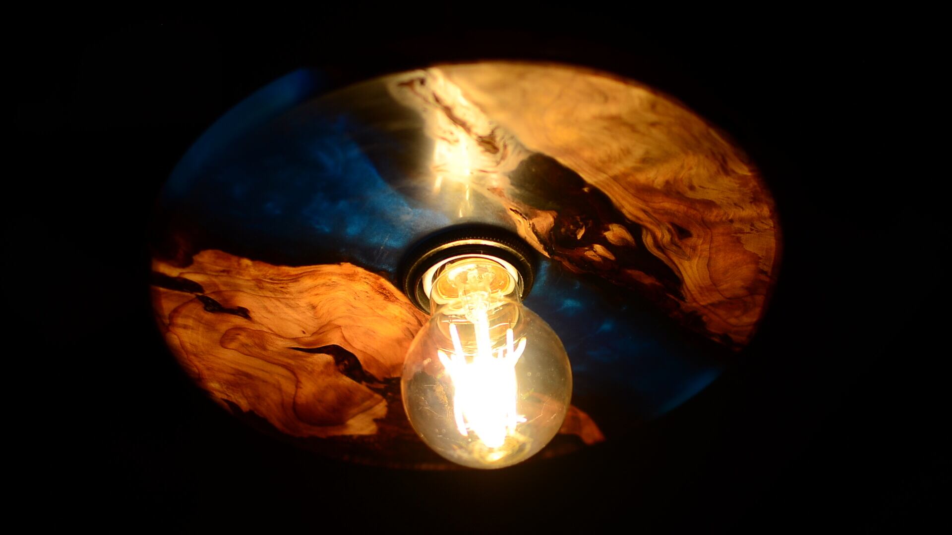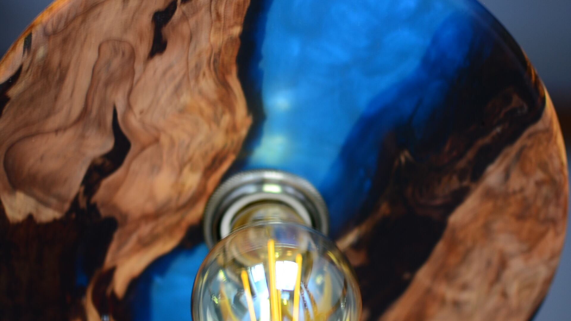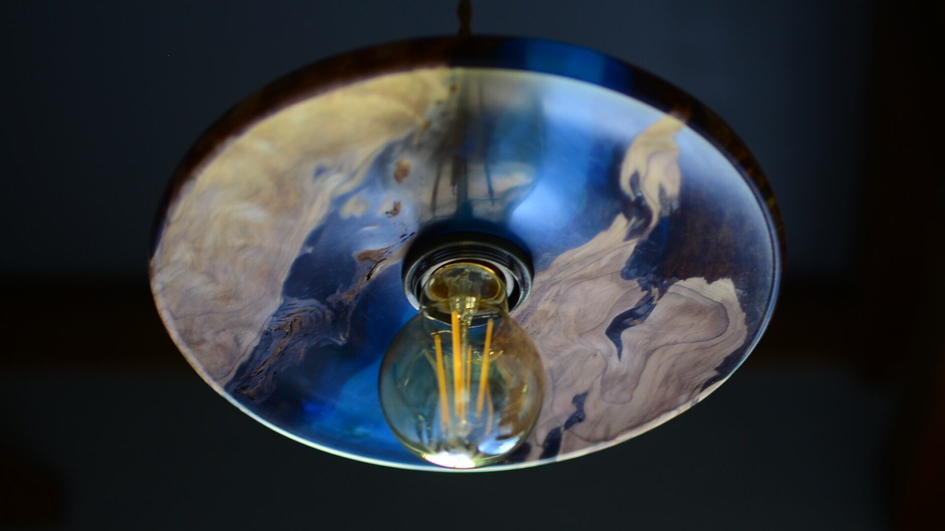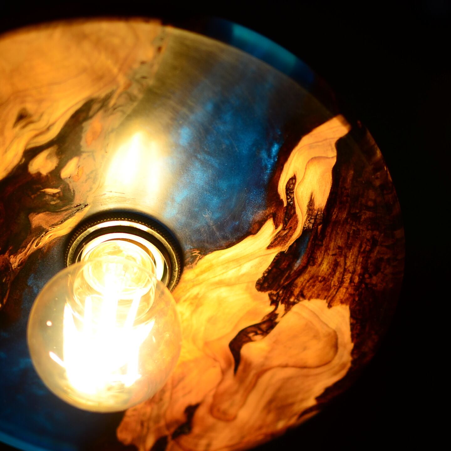 屋久島地杉と、深い青に染めたレジン(エポキシ樹脂)を組み合わせたペンダントライトです。点灯するとレジンの青色が柔らかくにじみ、屋久島地杉の独特な濃淡と溶け合います。